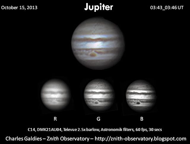 I had a late start with Jupiter this season. Conditions weren't good this early morning. Both seeing and transparency were poor. I was able to produce a fair RGB image. Some artifacts are evident in the northern hemisphere of the green channel image due to some fine dust in my DMK camera.